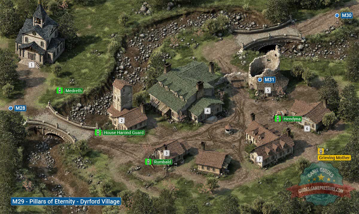 Dyrford Village is the second village that you visit in Pillars of Eternity. It is situated between two big cities - Defiance Bay and Twin Elms. While exploring the location, check out all of the buildings. You will find all necessary traders; you can also take rest there and hire adventurers. In Dyrford Village, you can receive several side quests, and you will also find a new potential party member - the Grieving Mother.