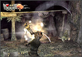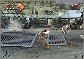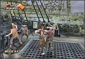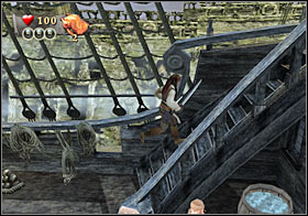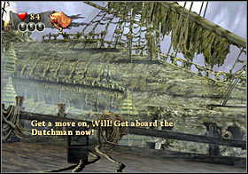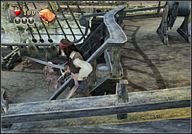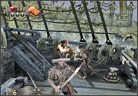 Focus all of your attention on guarding the stairs. Some of the monsters will try to get closer to it. Kill these creatures (#1). Be careful, though. Some of the monsters will appear near the stairs, so you can't leave this area. Otherwise you wouldn't have enough time to stop them. Once you've killed about 8-10 monsters, a new cut-scene should be displayed on your screen (#2). Jack will stay here and we'll take command over Will. It's time to explore the Flying Dutchman!