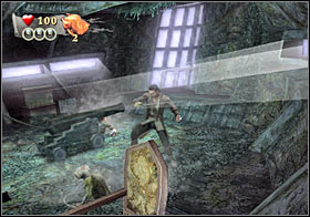 New enemies will arrive in the area (#1). Thankfully, this is going to be a much smaller group, however you must still be careful. Once they're gone, press the action key once again. You will be standing on top of a crate. Press the action key (#2) and use the ladder to climb up to a new platform.