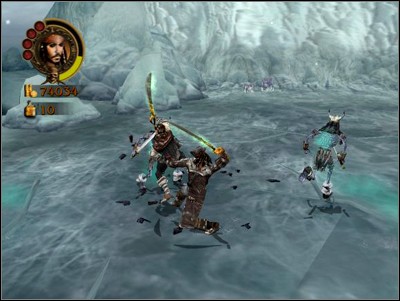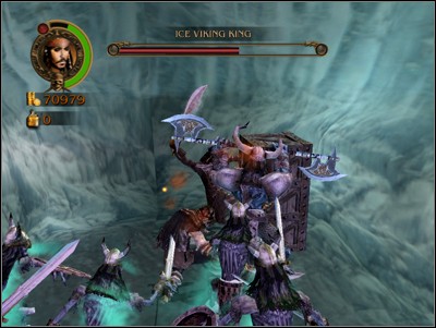 Next, go down the newly opened passage to the right, cutting down vikings as you go, until you reach a whale trapped under the ice. After watching the animation run towards the Ice Viking King's throne. Here, your goal is to destroy his throne (with Jack's Super Heavy Attack).