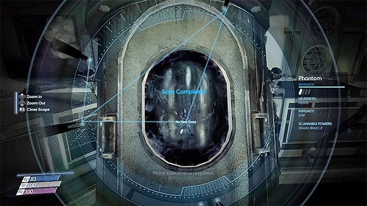 When you enter the atrium Alex Yu will contact your character. You learn that you need to calibrate the Psychoscope which is a part of a tutorial during which you learn how to use this device which can help you to unlock new alien abilities. Examine the capsules in the central part of the atrium. Keep revealing new capsules and scan the Phantoms held inside of them. After scanning two of them you unlock the base ability called Kinetic Blast I. Alex also gives you the code to the safe inside Dr. Kelstrup's office, although going to that location is completely optional (the location is a part of Dr. Kelstrup's Neuromods side quest).