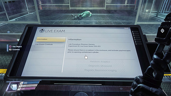 When you are in the computer's menu select the second tab (Live Exam Controls) and start the experiment. The result is that a Voltaic Phantom will appear in the room. You must defeat this monster and the best way to start this fight is to use an EMP charge or release a Nullwave (you can use a gadget or select the option to activate it from the cage's terminal). Then, you can use, e.g. the shotgun or alien abilities to weaken the creature.