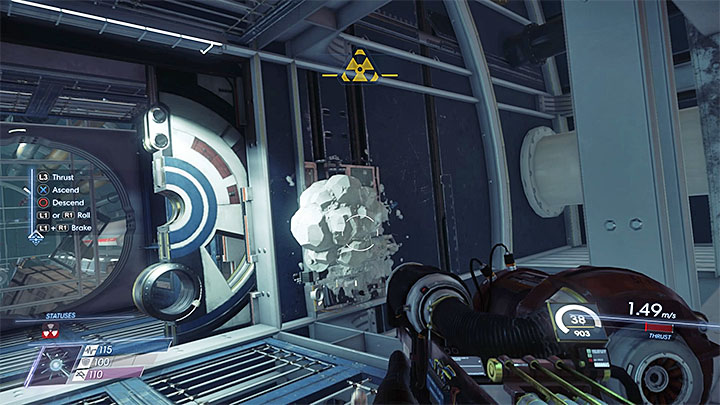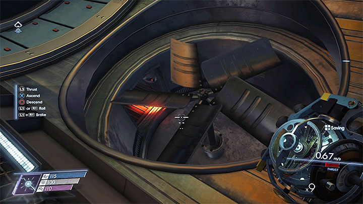 Continue flying until you reach the closed airlock. Look for an EMP charge (it should be in one of the crates) or select it from your inventory, if you have it already. Use the EMP charge on the big fan, presented in the picture above. By doing that you can stop it and move safely to another area.