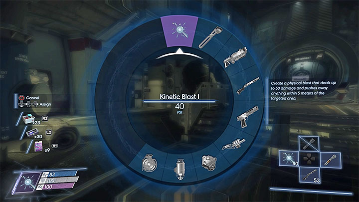 Note - This category of powers is built mainly from active abilities. Equip them by activating the wheel menu (screenshot 2) and assigning them to the chosen key. Using those abilities require additional PSI points (view the chapter on Combat to learn more about this mechanic).