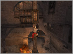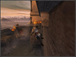 ![]() | Go towards the open platform, where doves hang out. You can see the panorama of burning town, overtaken with battle. Jump down from the platform to the gallery along walls and run left. The small building with closed door will bar your way. Clamber up the roof and go to other side. |