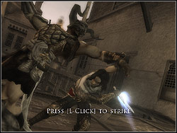 ![]() | Jump on the platform behind you, go down with the ladder. Be careful of the Guard strolling under you. If you surprise him from the back (speed kill), the clash will be short, otherwise you will toil up with him. Run down the stairs after the fight and head towards right gate. Kill the next enemy. |