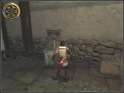 ![]() | Go to the right, when at the bend, fall onto the platform under you. Speed up now and running along the wall horizontally, reach the opposite end of the yard. Jump out upwards, catch the ledge and move on hands to the left. When you can see the break above yourself, pull up on hands and jump on the other side of the wall. Approach the fountain. Quench your thirst and regenerate strength. |