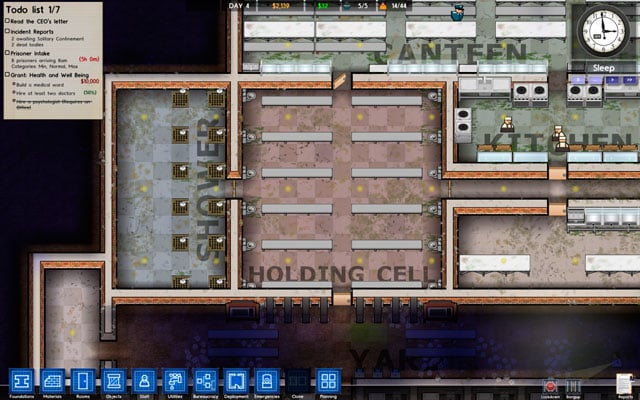 In the current version of Prison Architect, the holding cell should be created only to receive money from one of the grants (see: Budget). After receiving the prize, change the purpose of the room as it's not very useful on its own: it's much more important to invest in a bug amount of regular cells. That's also why you shouldn't dedicate too much space for this room and stick with the minimum size (despite what the above screen seems to suggest).