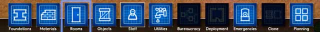 In order for the prison to function properly, you have to appoint special zones, rather conventionally called rooms (they don't have to be divided with a wall). Each one of them plays a certain role and is useful in one way or another. The rooms tab can be found in the lower part of the menu (screen above).