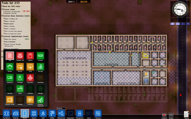 The further part of the guide contains a description of all rooms and their use, together with optimum size hints. Of course you should treat them only as advices - by far the most fun in the game comes from building your own prison. The guide only contains optimum combinations and parametres.