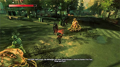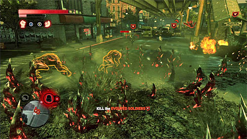 A fight with the evolved soldiers doesn't differ from your previous battles. If possible, try to attack your enemies one after another, remembering about avoiding their attacks. It is also worth to grab civilians running around the area (regeneration, bio-bombs, charging bio-mass bar) and consume every defeated evolved soldier.