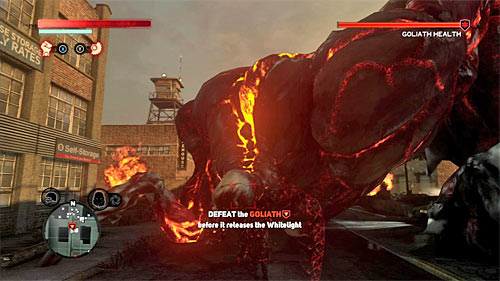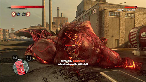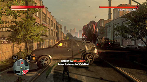 The duel with goliath is fortunately easier than it seems to be, although you have to watch out. The important message is that you can't leave boss alone because then he will approach the huge tank and you'll fail the mission. For attracting his attention you can use quick attack on a short distance or thrown at him cars for example.