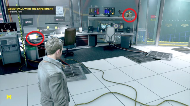 Enter the laboratory. Assist Paul with the experiment - pull the lever situated on a console, in one of the corners. Follow Paul, turn the key and activate the procedure on a computer.