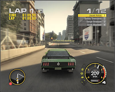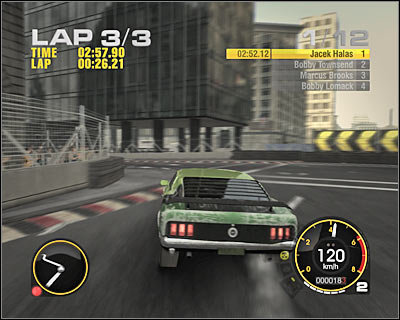 You should begin the first race with a good start. It's an important issue, especially if you've been forced to start this event from the back of the grid. Go through the first set of corners without crashing into anything and you should end up being third or fourth. Now you will have to go through several tight corners. Cut through the corners, but don't hit the tires. This is your chance to take the lead. Watch out for a VERY tight turn which is located in the middle section. Start slowing down early, because all muscle-cars are equipped with poor brakes. Also, prevent your vehicle from burning too much rubber. It may look nice, but it'll cost you a lot of time.