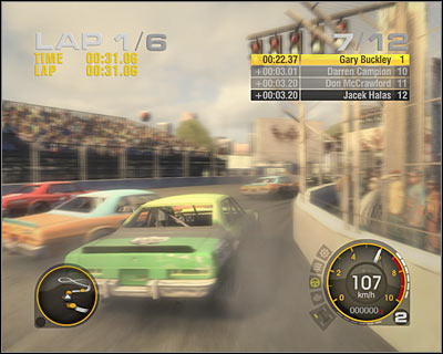 Don't worry if you slightly damage your car, because only heavier crashes will result in some major problems with the handling or the performance. There are some simple corners in front of you. Consider cutting through most of them in order to decrease the gap to the leaders of the race. Watch out for a long right turn (screen). You can't get too close to the left wall, because you may hit some of the tires. The second part of the lap will require you to go through several fast sections. After that, you will have to pass through a few sharp turns, but it's nothing you shouldn't be able to deal with.