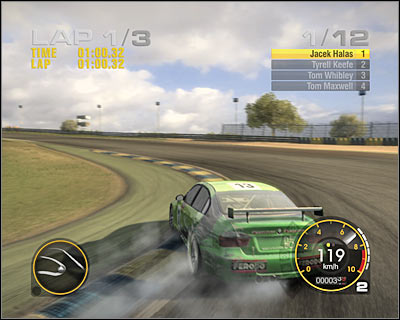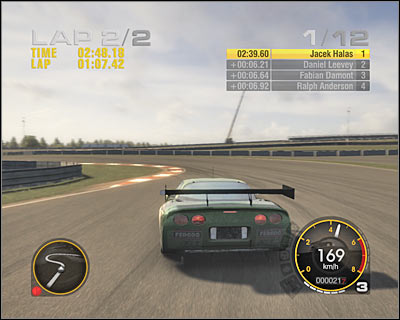 The first race is going to begin a with a very difficult chicane. You will have to avoid straying off the main track, because your car will immediately lose grip on the grass. You should be aggressive here on the first lap, however focus on precision on the following three laps. Once you've dealt with the first section of the track, you'll come across a new difficult corner (screen). Slow down here slightly, so you'll avoid any problems. Focus on overtaking other cars, because the next section is simple. Watch out near the finish line, because the last corner is tricky.