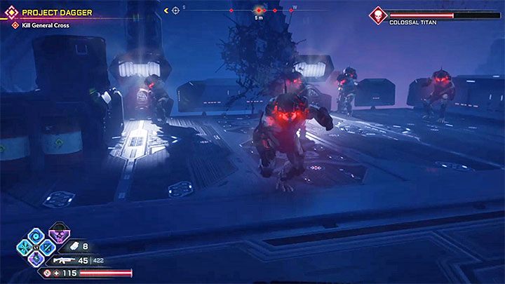 Titan can be weakened by shooting in his weak points - these will change from time to time during the battle. The boss hits the ground with his fists, causing shock waves. Jump over them. Grav-Jump will help you in this duel. It may be used to stay in the air a bit. Also, avoid "fireballs" by running on the sides if necessary.