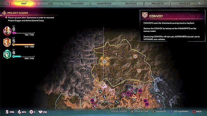 By default the game does not allow you to track convoys, but you do not need to, fortunately, spend time searching for them. By completing the Wasteland Celebrity story mission, you get access to a new tree in projects - Capture & Control. One of the projects of the first class is the Convoy Locator. Since the acquisition of it, arriving convoys will be marked on the world map with tire icons.