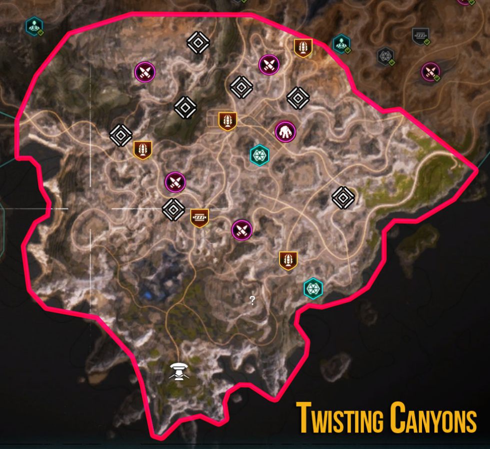 This page in our guide to RAGE 2 contains the map for Twisting Canyons region. This area serves as the starting location. We have marked all locations you can visit. They include authority sentries, arks and bandit dens.