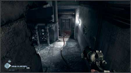 At the end of the corridor you'll find explosives and some parts. Collect all and get down.