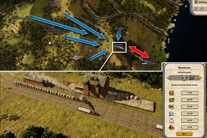 How to use Warehouses? One of the more effective methods is to build such a structure somewhere between a cluster of different production centers and a city. Some of the connections will only transport resources to the warehouse, and several other trains will run to the neighbouring cities. This way, you will reduce traffic on the tracks and the number of trains. The trains traveling between such a warehouse and a city will select resources themselves, taking into account the city's needs. If necessary, they will fill their railcars to the brim with grain or fill some of the wagons with cattle, wood and vegetables. You can also bring goods to cities from such stations, but not passengers or mail.
