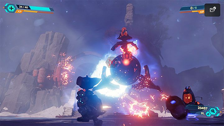 Don't expect that freeing the monks will be an easy task, as reinforcements will show up while Kit is disarming security. Notice that Kit's health bar is visible on the screen and you can't let her die. You must react aggressively to all enemy attempts to reach the place where the monks are held captive - cover Kit if necessary and use strong ranged weapons (e.g. the Negatron Collider) before the opponents get too close. You can also summon Mr. Fungi to help Ratchet eliminate enemies.