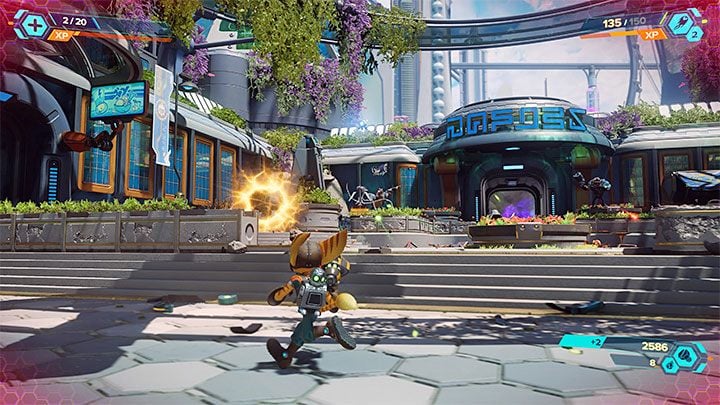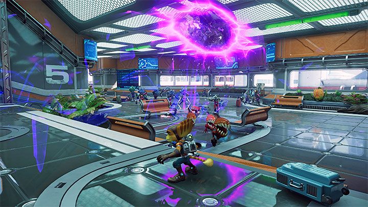 Return to the main platform and this time investigate the rift to the left, which allows you to resume crossing the station. Get ready for new battles. Remember to keep monsters that want to bite Ratchet at bay.