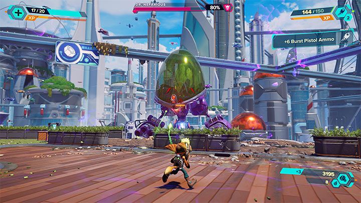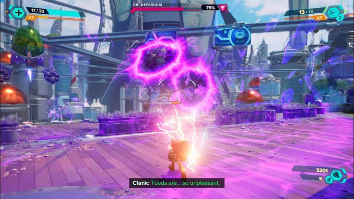The pursuit of Nefarious will begin right after the first cutscene with him. Its initial part takes place on rails. You have to jump onto adjacent rails to avoid contact with discharges and colliding with indestructible obstacles.