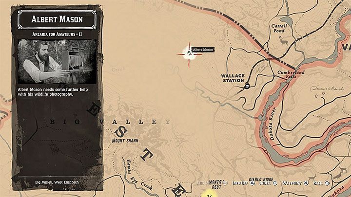 This mission marker appears a little bit to the south from Valentine. Mason is standing on the edge of the cliff - he wants to take pictures of eagles. This is the shortest part. Watch the cut-scene during which Arthur will safe Mason from falling down.