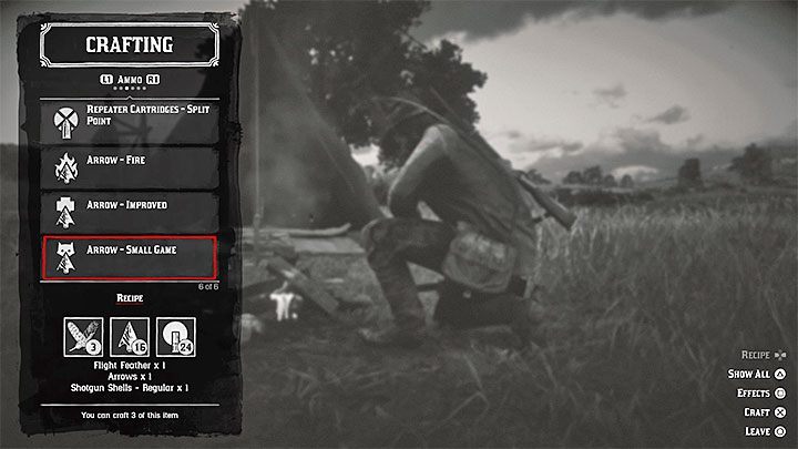 - Small Game arrows for hunting small animals are useful if you need to hunt, for example, a squirrel, a snake or a rat. You can make these arrows by yourself after reaching the campfire and opening the crafting window. In order to prepare a single "small arrow", you must have a normal arrow, plus a feather (kill birds) and an ordinary shotgun cartridge.