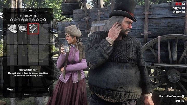 Perfect skins and leathers can be sold like any other, but it's better to use them for crafting. First of all, you can return to the gang camp and give Pearson all perfect pelts. It will be put aside for Arthur's bag improvements and to the gang camp upgrades. Many crafting improvements require the acquisition of a few pristine pelts of animals of a particular species, so look for more opportunities to find the perfect specimens.