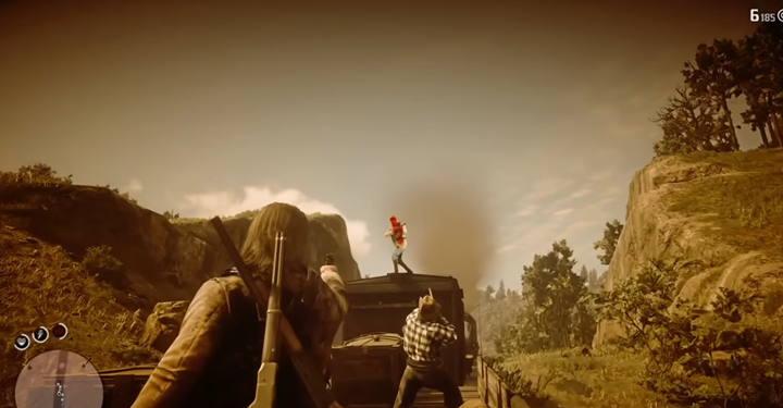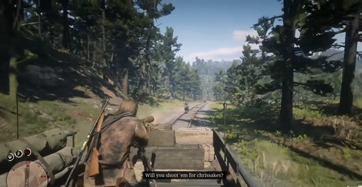 Move towards the front of the train and kill subsequent enemies. Proceed until one of your enemies causes a fire. Walk up to the railing and jump on Dutch's horse. With the help of your companion, reach the next car. After the cut-scenes, dispatch the enemy with a headshot.