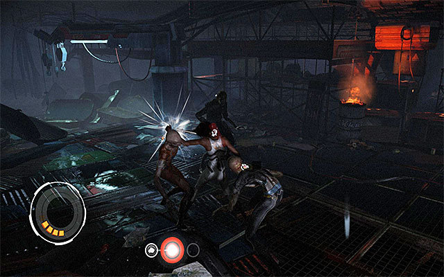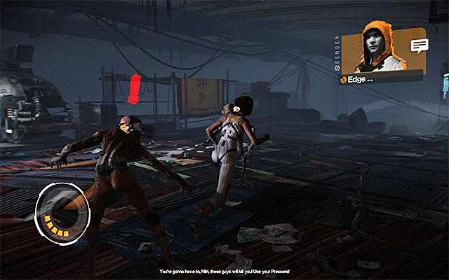 Right after the beginning of this episode, you will have to fight your first fight with mutant outcasts called Prowler Leapers. At first, test your quick dodges. At the same time, pay attention to the red exclamation marks above your enemies' heads. These notify you of the imminence of their attacks.
