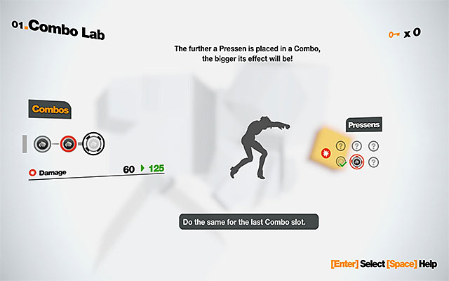 Before you start to land your own blows, you are going to see a tutorial concerning the construction of combos. Start by bringing up the Sensen chip menu and selecting the first item on the list (Combo Lab). As of now, the main character has two basic power strikes at her disposal (Power Pressens). You can use these to create a combo of three fist strikes. The first strike always comes predefined so, there are two more slots that you can define yourself. (the above screenshot). In general, taking into account the fact that you are early into the game, you cannot make any serious alterations here and, to all intents and purposes, you can only define the sequence in which the basic movements are going to be delivered. It is worth mentioning here that each consecutive strike is a bit stronger than the previous one. For example, if you place a strike in the third slot, instead of the second one, this individual strike will inflict more damage (this also means that, in order to reach that strike, you will have to press two buttons instead of one).
