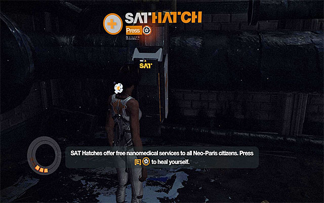 Continue launching your attacks and remember to dodge frequently because, as of now, Nilin is not capable of healing herself. After you deal with the mutants, listen to the conversation with Edge and take the only available exit from this location, which will allow you to reach the medical spot (SAT Hatch) shown in the above screenshot. Stations like this one will allow your character to heal free of charge.