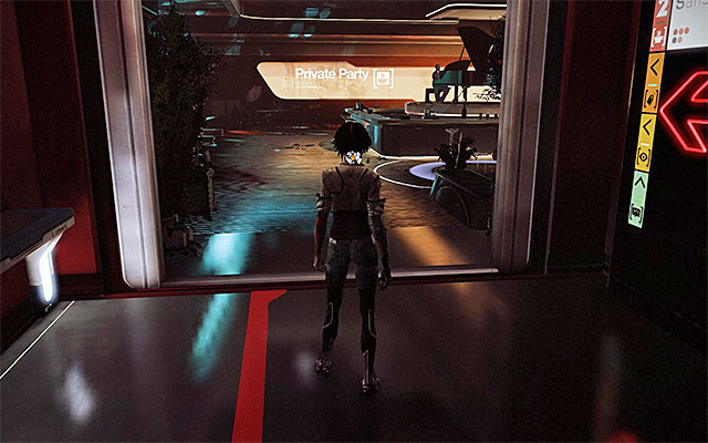 The memory is on the big table in the part of the bar where the private party is being held (screenshot 1). Explore the location thoroughly and make sure that you do not come close to the combat drones. The memory is on the table under the blue disco ball (screenshot 2).