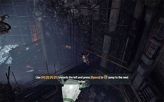 You now need to make a leap and catch onto the interactive ledge that you can see in the distance so, make sure that you take a run-up before you press the jump key/button (in the appropriate moment). After you catch onto the ledge, shimmy to the left. After you reach the scaffolding, jump towards the next interactive ledge overhead. Continue climbing and move to the left. Perform a simple jump to catch onto the neighboring ledge. Wrap it up by pressing the interaction key/button to drop off the ledge.