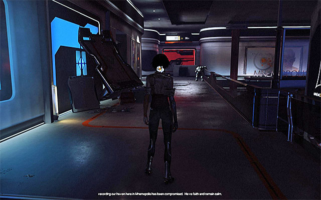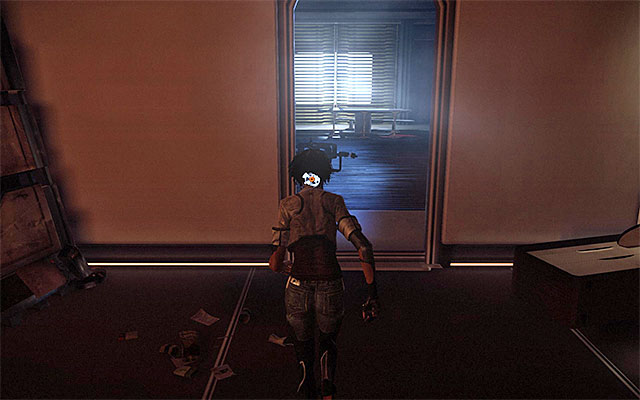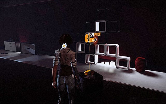 Approach the door. You do not need to hurry to enter the area because the corridor behind the door is patrolled by a combat drone. Start by going left. Walk around the drone to the right, and reach the entrance to a room to the side (screenshot 1). Explore the room thoroughly to find a SAT Patch (screenshot 2).