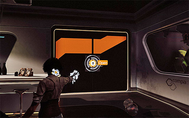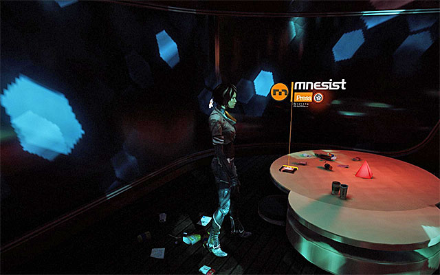 Start exploring the bar, watch out for the patrolling drones and keep following them. There is a Scaramech clinging to the piano located in the central part of the room (screen 1), and on one of the tables, there is a Mnesist Memory under the ball (screen 2).