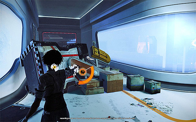 Pay attention to the combat drone that is patrolling this area. Try to reach the debris located opposite the entrance. While avoiding the drone, find another