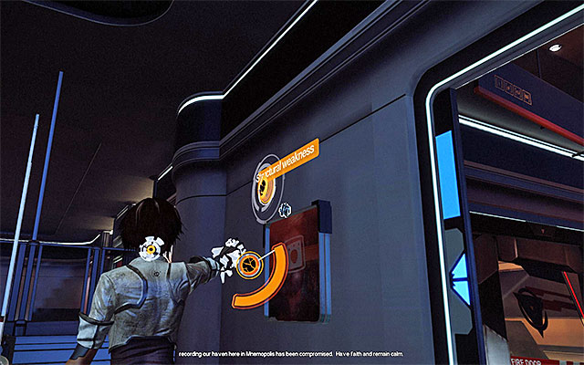 Right after you enter the next area, turn right and aim at the interactive object shown in the above screenshot. Destroy the item with the Junk Bolt. Doing this will reveal another Scaramech, which you need to eliminate.