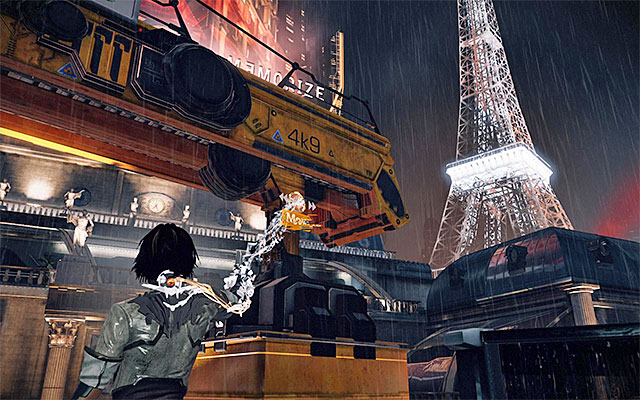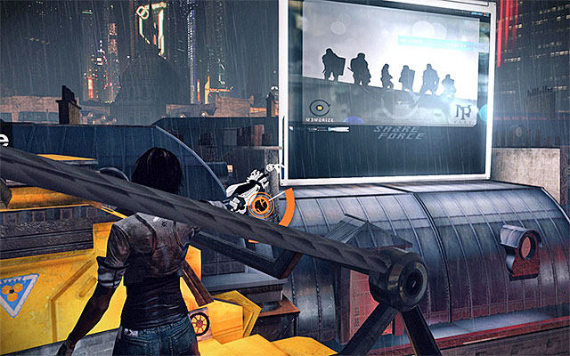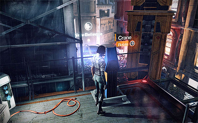 Listen to the conversation with Edge, concerning the possible means of accessing the Memorize headquarters, after which you should go left. Interact with the Crane control, to rotate it.