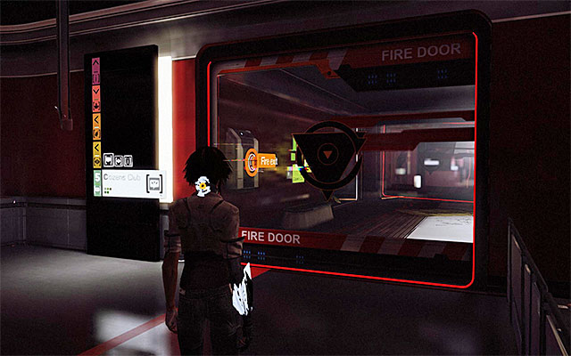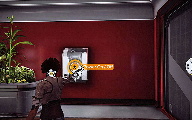 After you reach that location, turn your attention to the locked door shown in screenshot 1. Aim at the Fire Exit button behind the glass pane, and use the Pick Socket to charge the panel with energy that you have just harvested. After you unlock the area, explore it to find the Focus Boost lying on the floor (screenshot 2). After you collect it, return to the main area and drain the terminal to retrieve energy for the Pick Socket.
