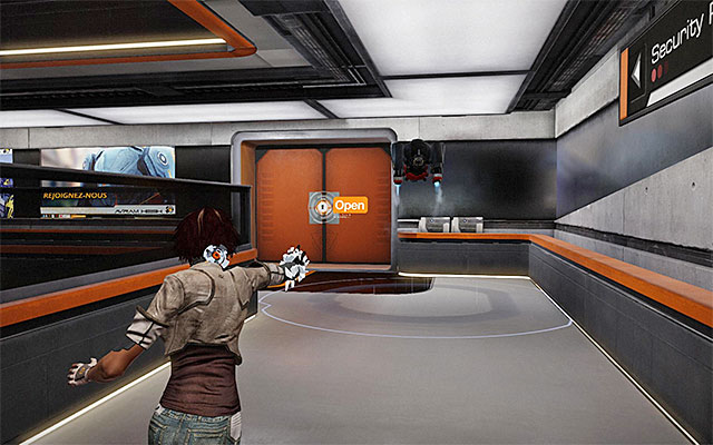 You can now return to the main area (keep all necessary precautions) and start following the combat drone again. This time, stop only after you reach a bigger door to the Central Security Post.