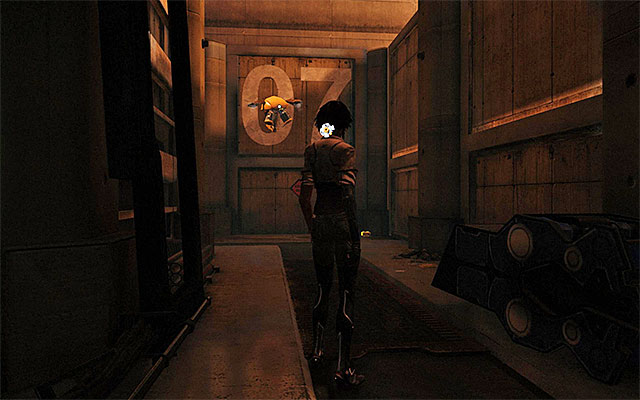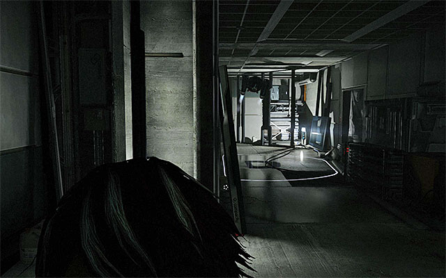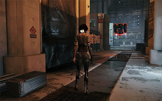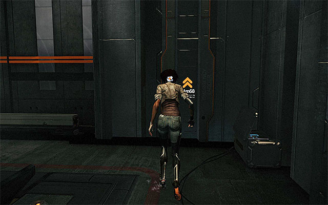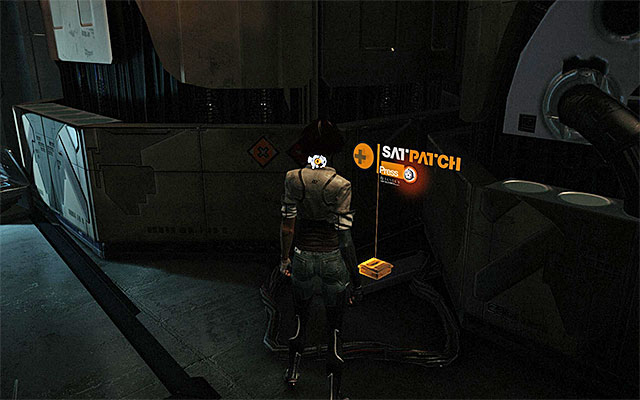Start exploring the linear corridors and find a SAT Hatch) on your way. Stop in the area patrolled by the combat drone. Follow it and make a short stop in the corner shown in the above screenshot. Wait for the drone to pass you by and go on. Stop once again after you reach an interactive screen.
