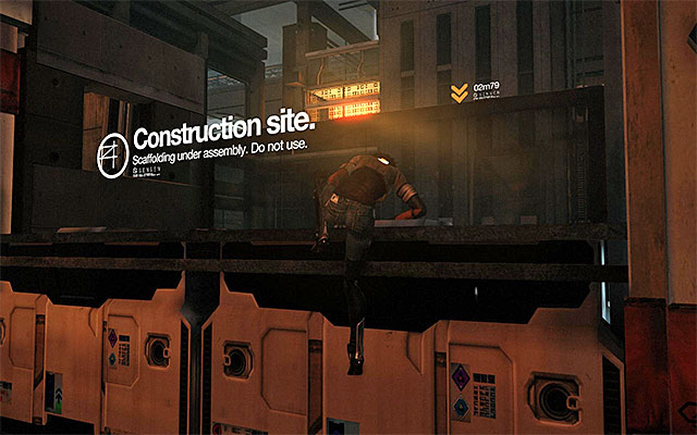 Go straight ahead and leap towards the nearest ledge. Continue along the linear path and listen to the conversation with Edge, and also examine the interactive screen. Stop in the spot shown in the above screenshot because, here you will encounter a combat drone patrolling the area. Just like in the case of the previous episodes, you need to avoid the drone's range of monitoring (the circle around the machine), or else this is going to be a terminal encounter for Nilin.