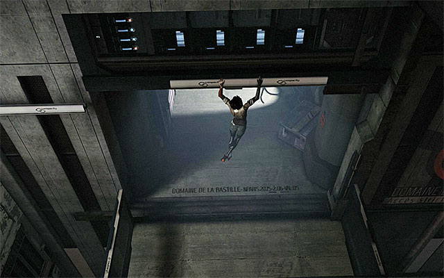 Again, position yourself at the two main planks, wait for one of the drones to appear and resume your march. Follow the drone until you reach an interactive ladder. Jump to grab the ladder and climb up it, lean back and perform a leap towards the catwalk located above. Listen to the conversation with Edge.