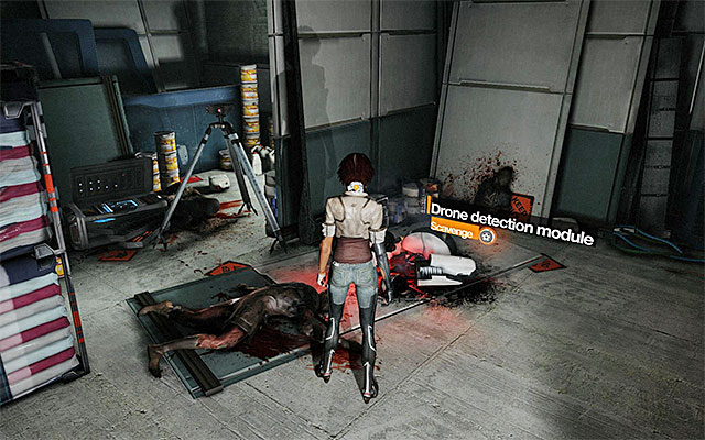 Follow Edge's suggestion and approach the drone destroyed by mutants. Examine the machine to obtain a Drone Detection Module. After collecting, the device will automatically integrate with your Sensen Chip, which will display all of the areas monitored by combat drones. This makes for easier avoiding of these machines. You can now open the nearby door and leave.