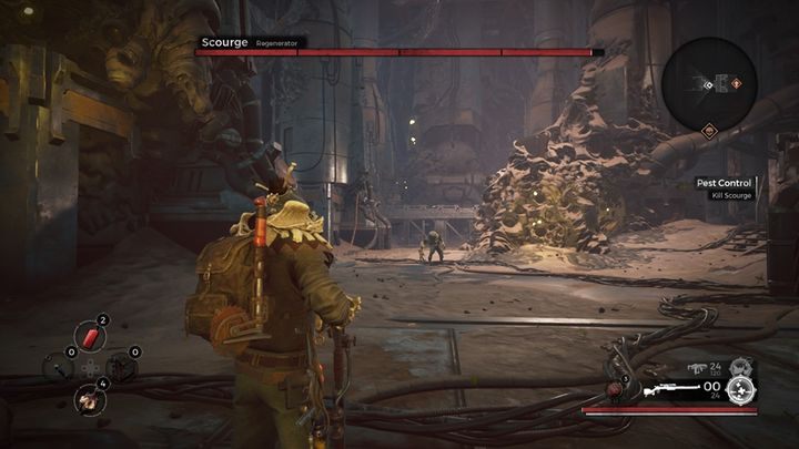 At the very beginning of the fight, Scourge will be slowly heading in your direction, this is a good opportunity to deal damage from a distance, while remembering to avoid shooting in the head (the hive). Otherwise you will release many insects from the hive, and they'll attack. Over time, he will be aided by 2 mobs that activate local poison clouds after they're killed, causing Radiation damage - avoid them.