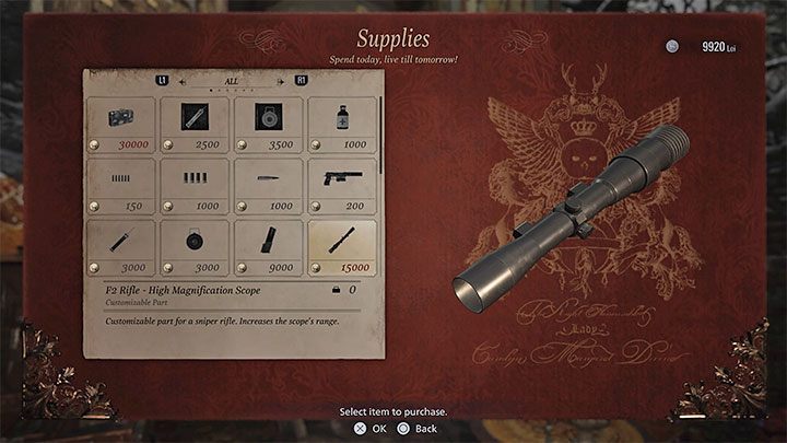 - Extra Baggage - 10000 Lin - you can permanently increase your inventory size. This is one of the most important upgrades, especially since Ethan will find a sniper rifle taking up a lot of inventory space while in the castle.
